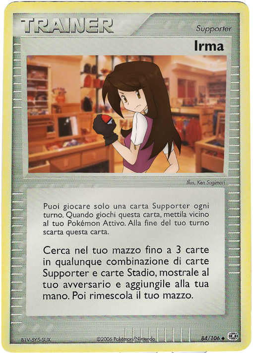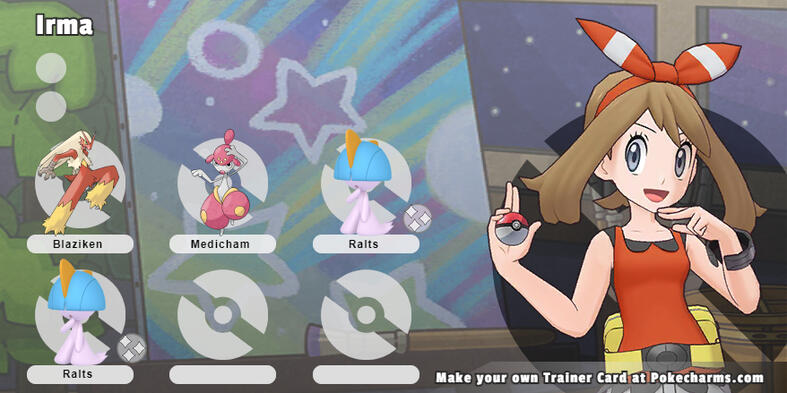 region - LaRousse City (moved to Hoenn)Irma works at the Battle Frontier as Tucker's assistant, other than helping him she mainly spends her time battling and hanging out with her friends, she can be sometimes bratty and annoying but she can also be friendly (sometimes... rarely...) she likes to create Pokémon-themed outfits (like Harley's or Lucy's).